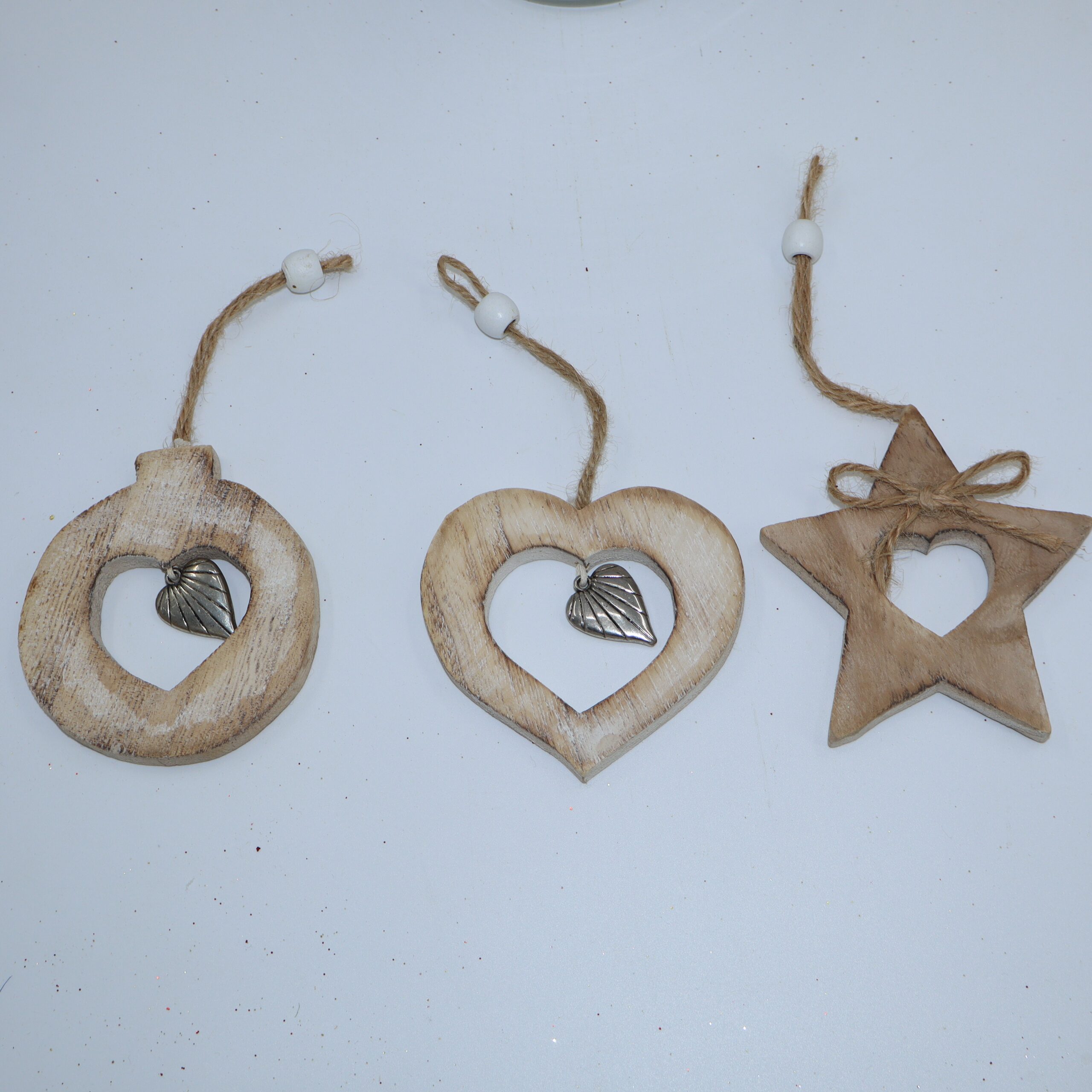Decorazione in legno naturale, composta da 3 forme assortite.