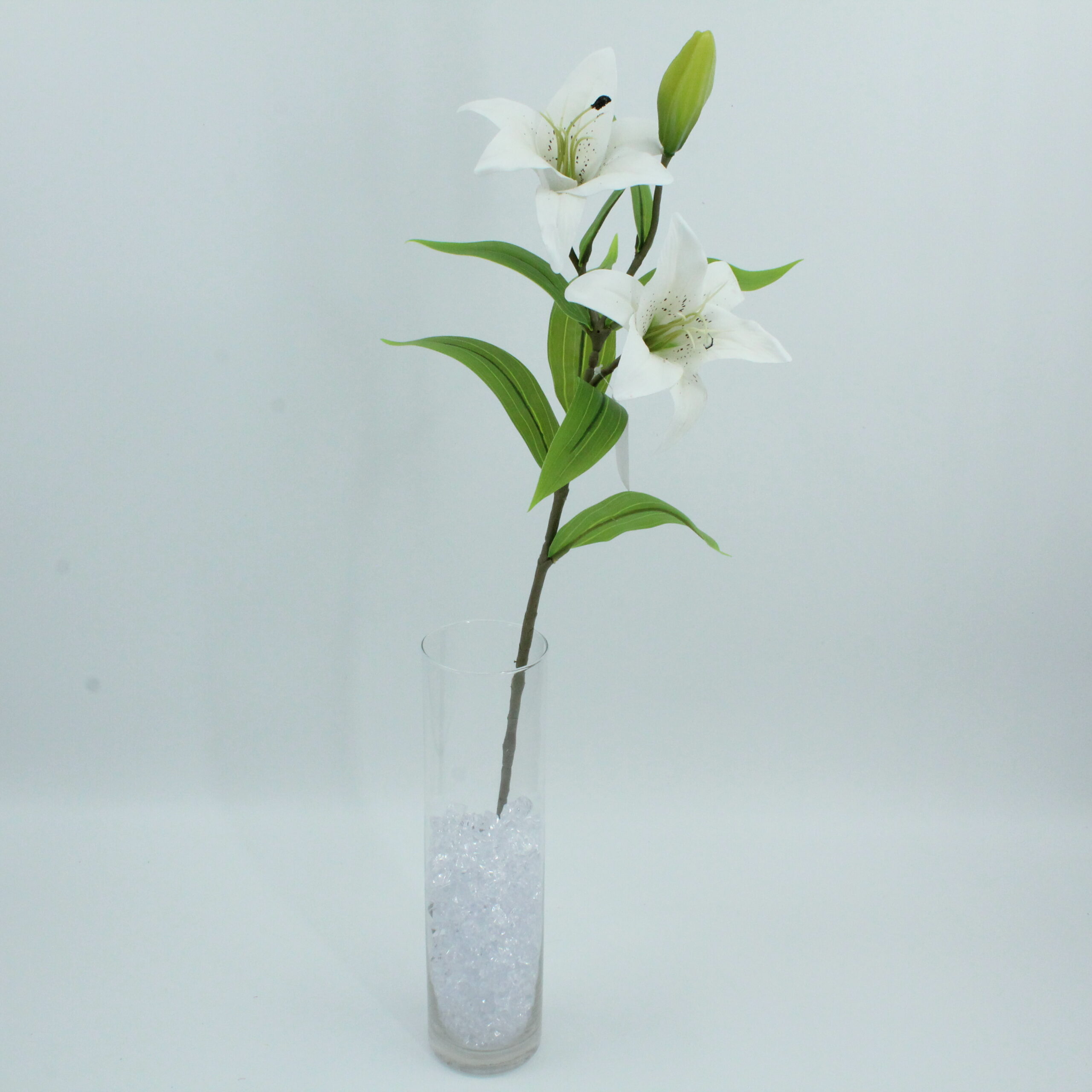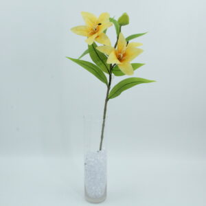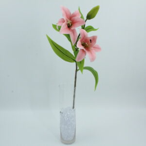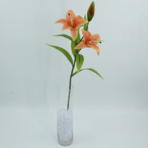 Lilium artificiale realizzato in lattice, con due fiori e un bocciolo. Aspetto realistico, texture morbida e colori luminosi per composizioni eleganti.