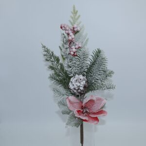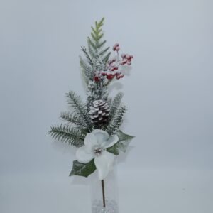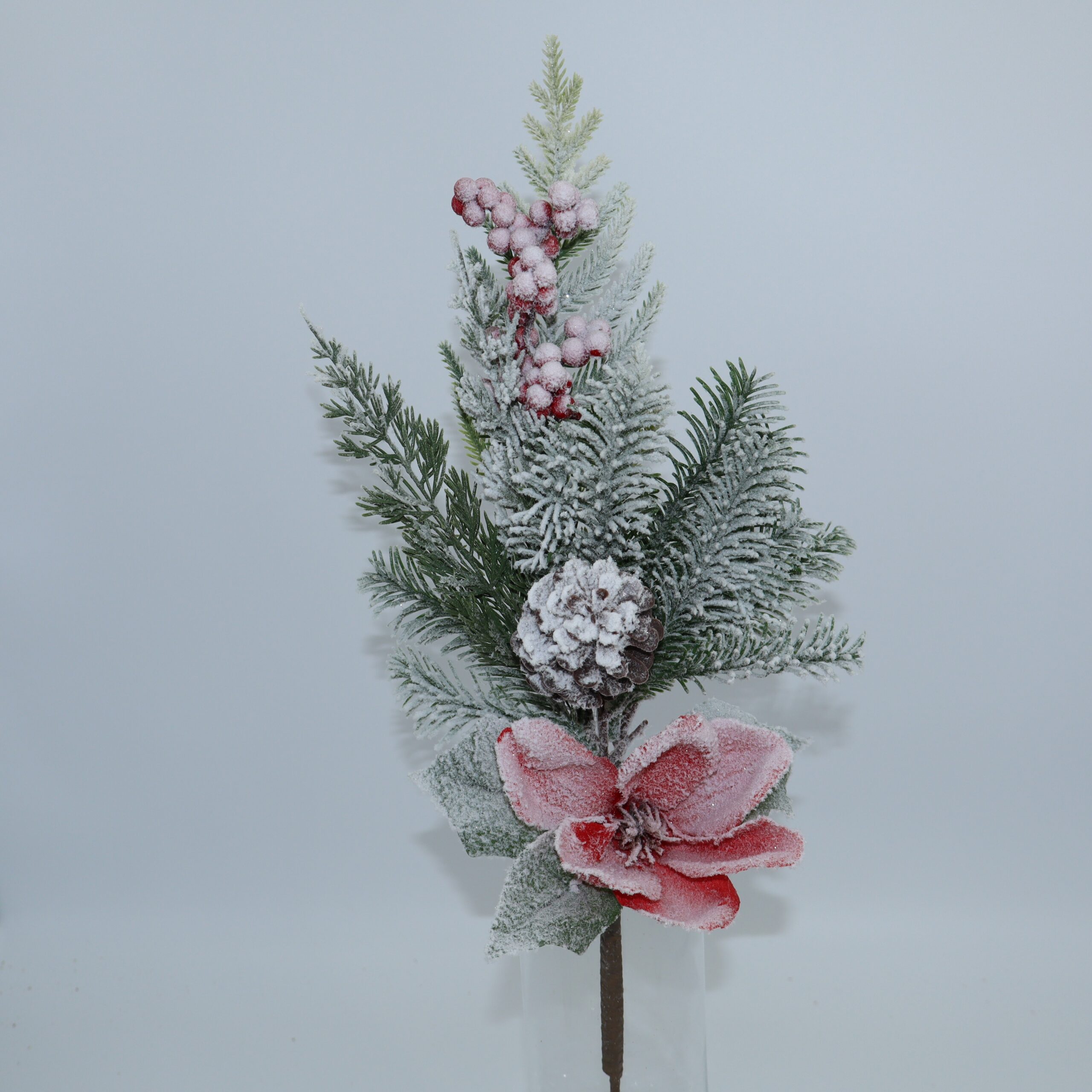 Pick decorativo con dahlia in fiore e rami di pino, perfetto per creare composizioni festive ricche di colore e volume. Ideale per arricchire vasi, bouquet, centrotavola e allestimenti natalizi d’effetto.