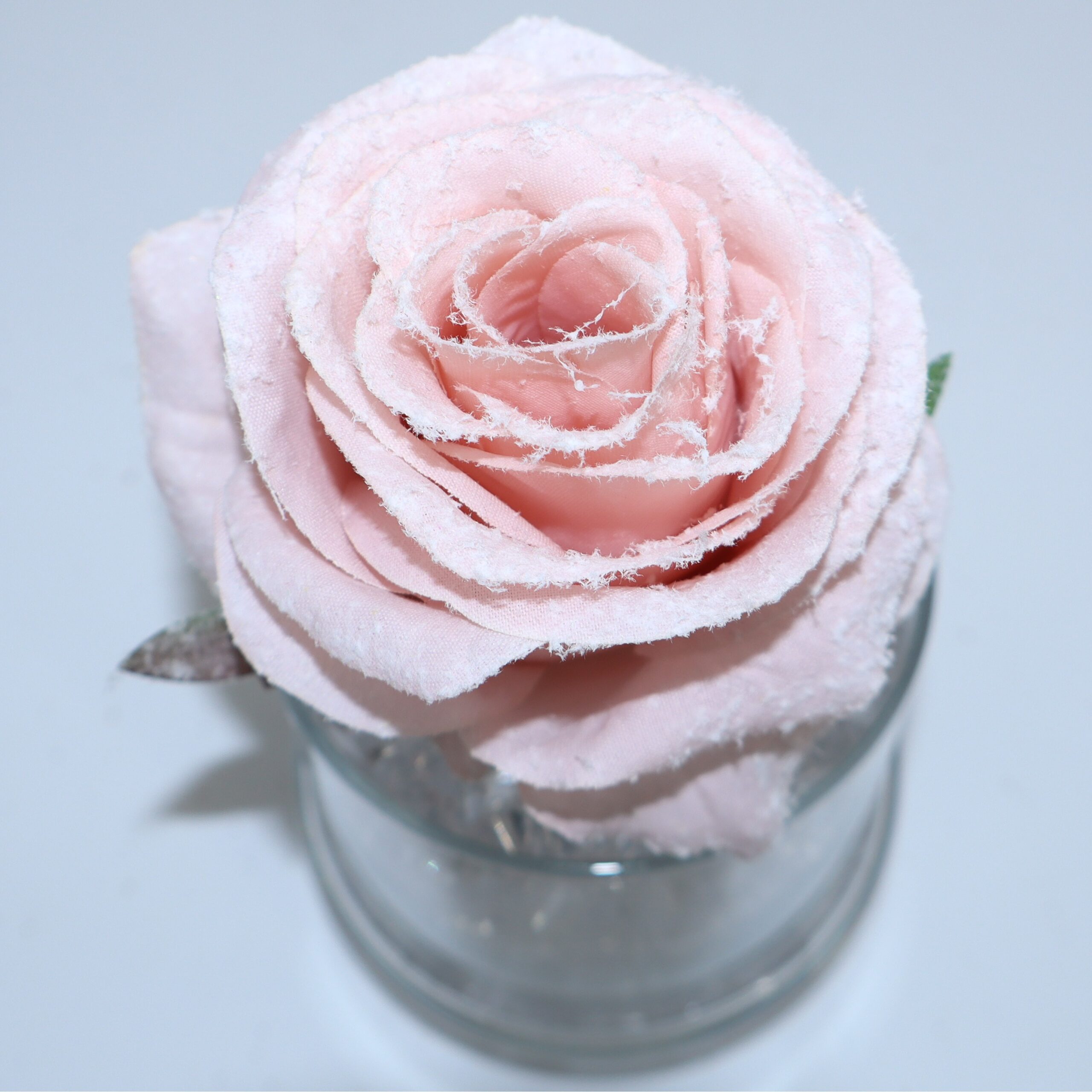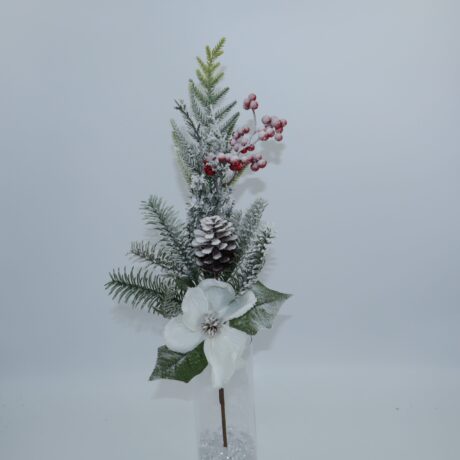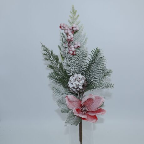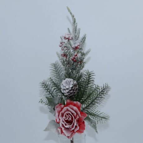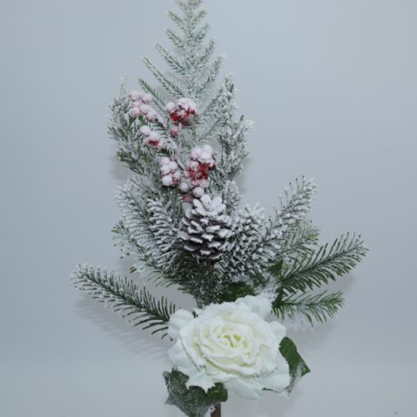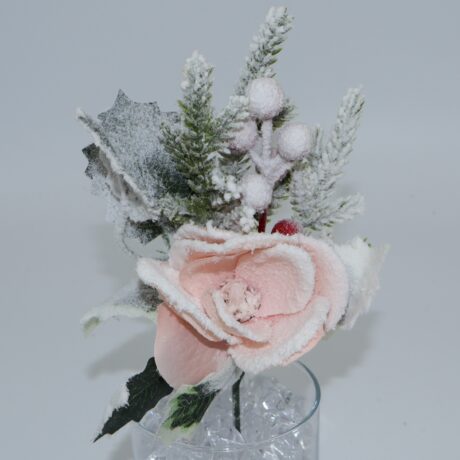 Pick con rosa artificiale effetto neve, perfetto per arricchire centrotavola, ghirlande, bouquet natalizi e decorazioni eleganti.
