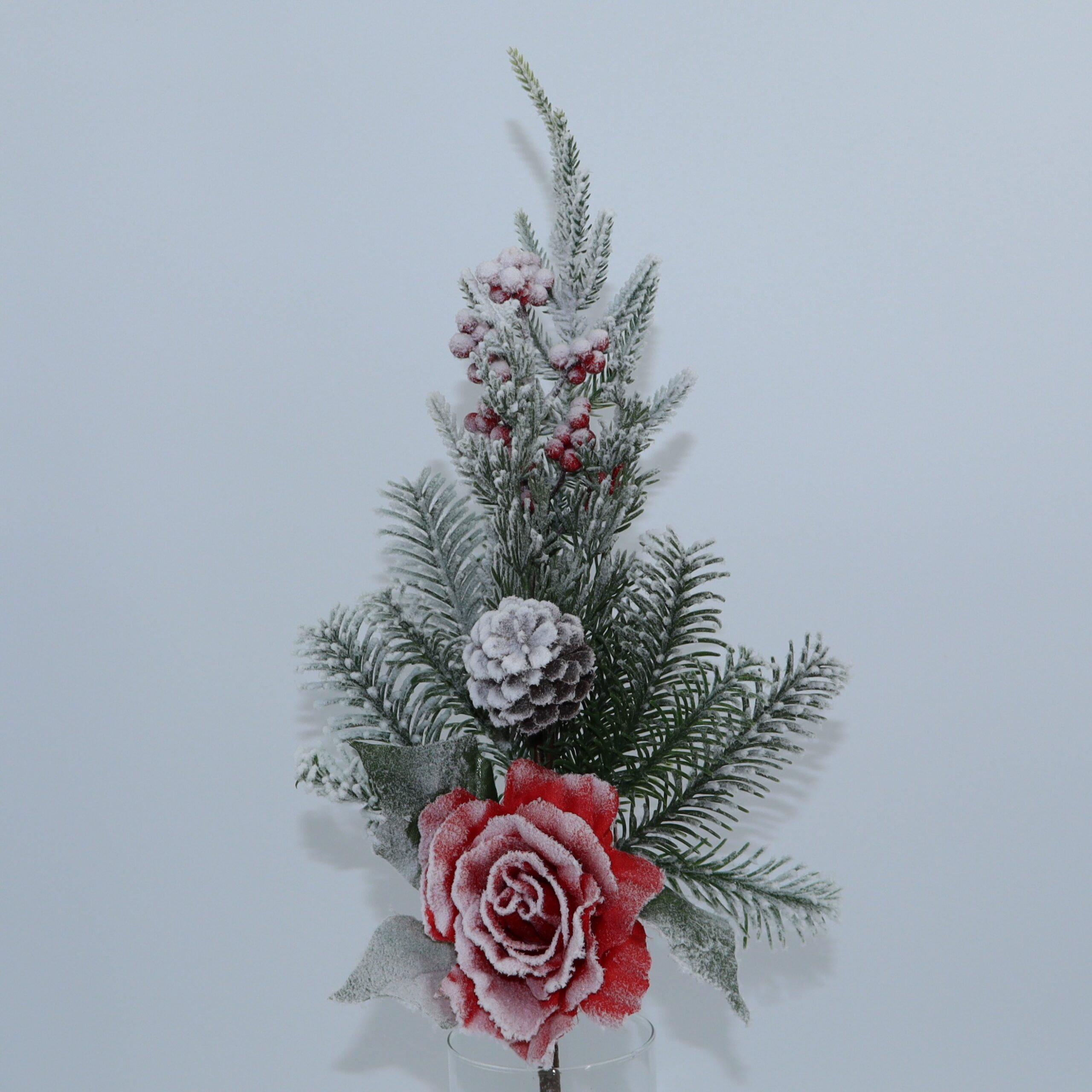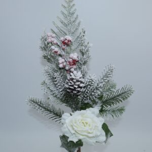 Questo spray ornamentale combina una rosa decorativa con bacche e dettagli invernali, creando un effetto naturale ed elegante ideale per il periodo natalizio.